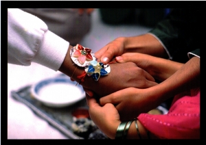 - The sister ties a rakhi on the wrist of her brother’s right arm. The rakhi is made of red thread, and silk and glittery tinsel. It is often in the shape of a star or a flower. Sisters make them or buy them from a shop.